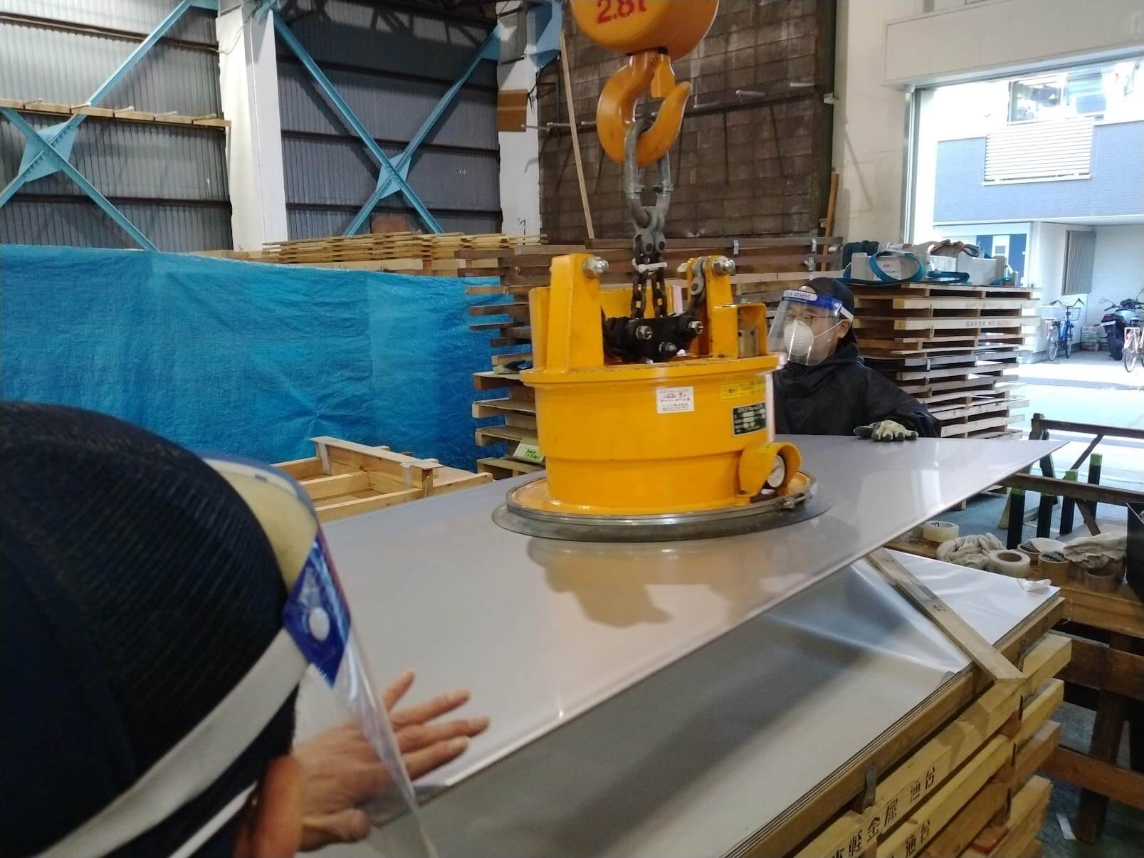 ニッカル商工では、重量のある板類を取り扱う際には バキュームリフターで作業をしています。 写真は、ステンレス敷板のバリ取り作業時のものです。