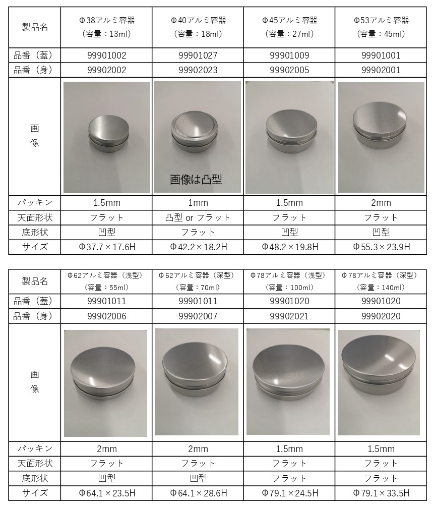 アルミ製容器(アルミ製スクリュー缶)のサイズ表はページ下側