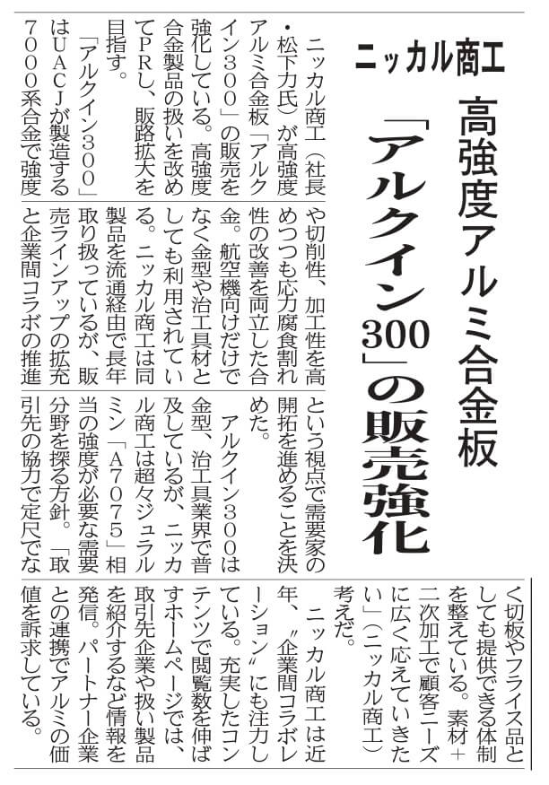 「高強度アルミ合金板 アルクイン300の販売強化」について
