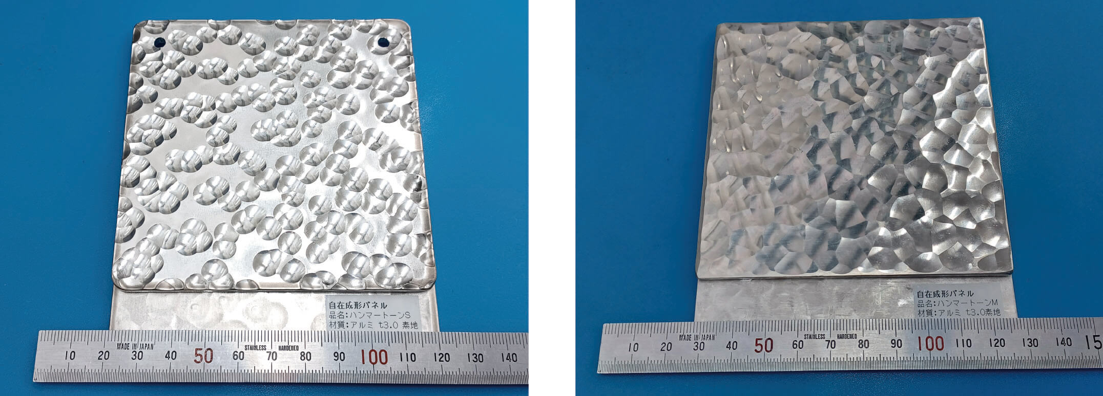 アルミ板の生地材へ、手打ちハンマー仕上げの様なランダムなハンマートーンを実現しました。 独特な風合いで特別な雰囲気を演出できるアイテムです。