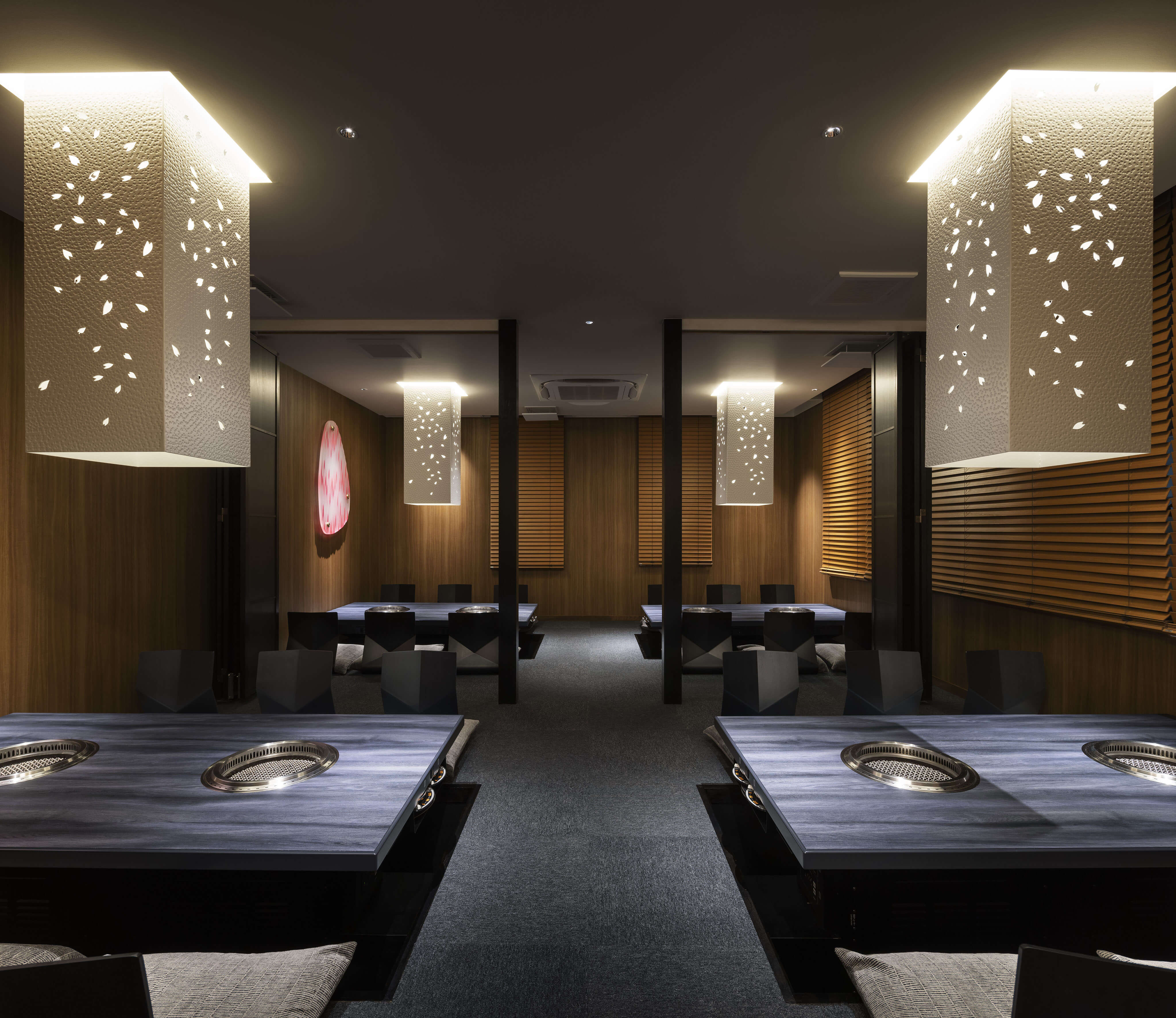 写真:「菅野 佳生 / ナカサアンドパートナーズ」アルミテクスチャー加工板(HAMMER(S))を照明カバーに用いることで、光と影のコントラストが美しく表現され、ラグジュアリーな雰囲気を演出します。飲食店の新店やリニューアル等で新鮮さと高級感を求めるなら、アルミテクスチャー加工板が最適な選択です。様々なデザインや形状、テクスチャーが揃い、お店の特性やコンセプトに合わせた自由度の高い内装が実現可能です。