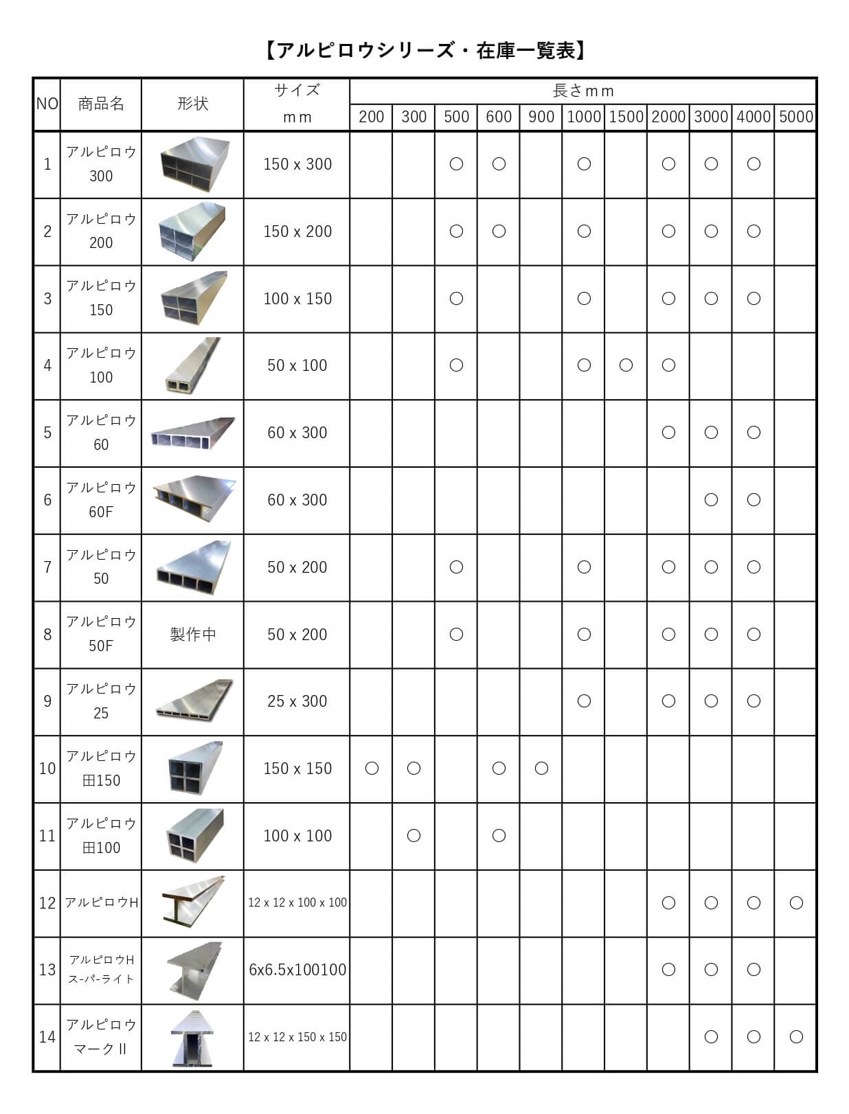 アルピロウシリーズ(アルミ枕木)の在庫一覧表です。