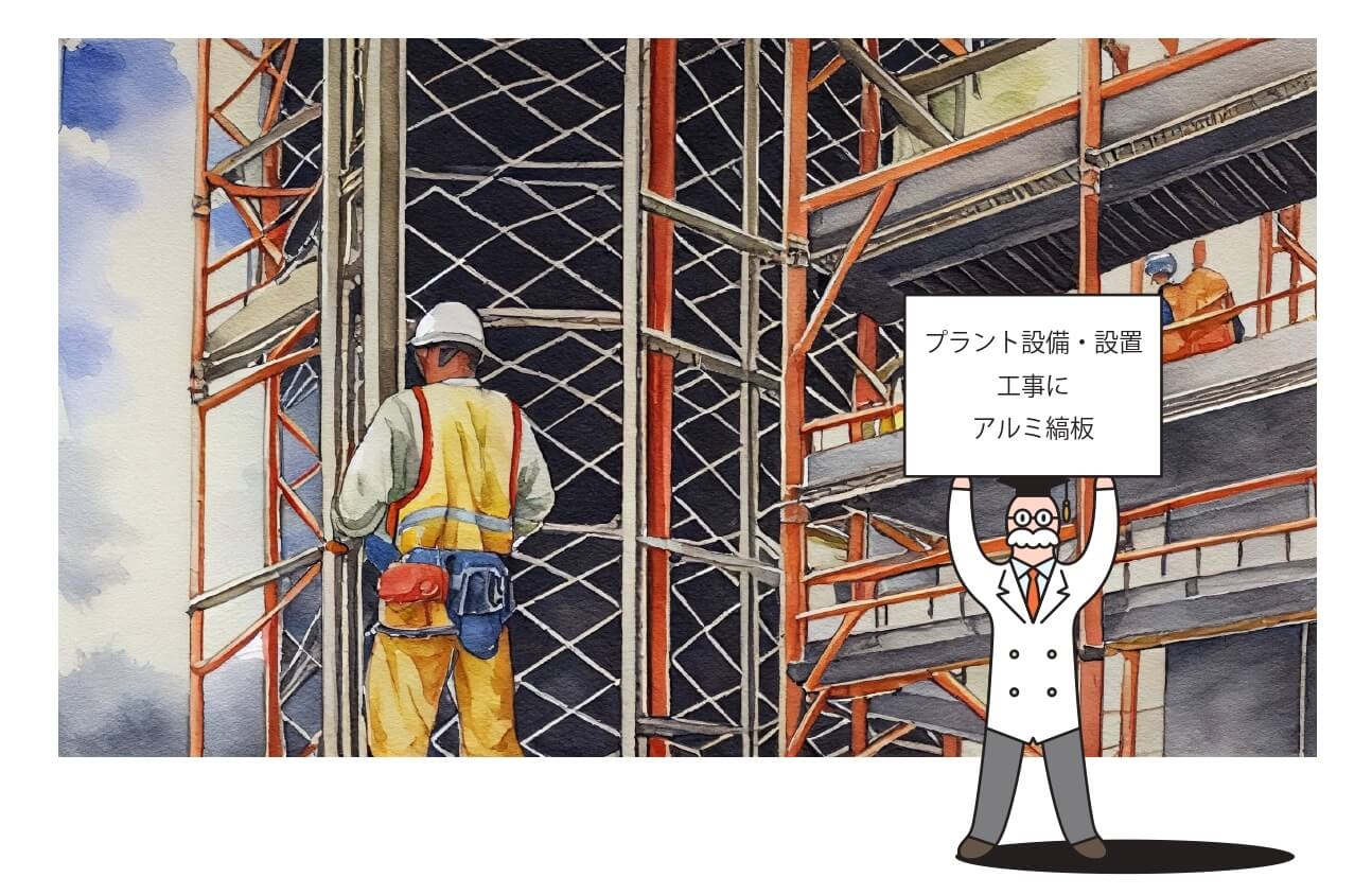 車両関連の他にも、【プラント設備・設置関連の足場】にアルミ縞板(縞鋼板)が多く活用されています。 板の表面にある「5本線の縞目」を滑り止めとして活用いただき、工場内の敷板や足場など幅広くお使いいただいています。